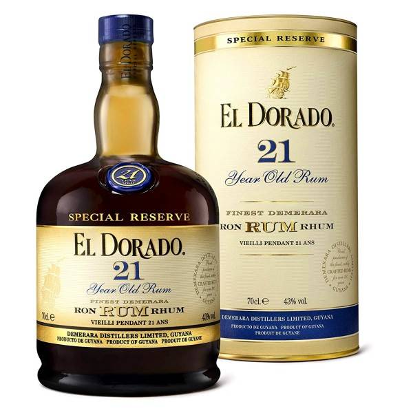 Rum Eldorado 21 anni cl 70 dal Guyana composto da distillati con almeno 21 anni di invecchiamento in botti di rovere aroma di frutta matura e tostata con note di caffè e cioccolata