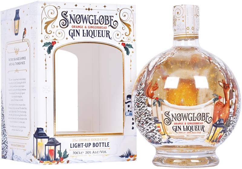 Gin Snowglobe Orange e Gingerbread cl 70 bellissima sfera di vetro che contiene un liquore al gin con arance pan di zenzero spezie e scaglie di oro alimentare 23 KT che volteggiano agitando la bottiglia
