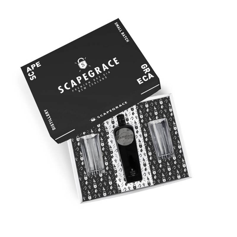 Gin Scapegrace Special Pack cl 70 con bicchieri alla Nuova Zelanda nella originale confezione aroma dalle note fruttate degli agrumi aromatici e piaccanti delle bacche di ginepro alpino finale finale speziato e fruttato