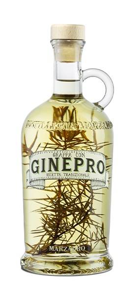 Grappa con Ginepro Marzadro cl 50 ottenuta dall'infusione delle bacche di ginepro distillate separatemente poi miscelate gusto aromatico e persistente