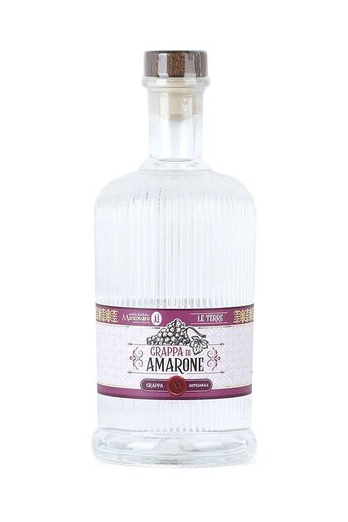 Grappa Amarone Le Terre Mantovani cl 50 dalla distillazione di uve corvina molinara e rondinella al naso sentori di frutta sapore ricco morbido persistente e nel contempo di grande armonia ed eleganza