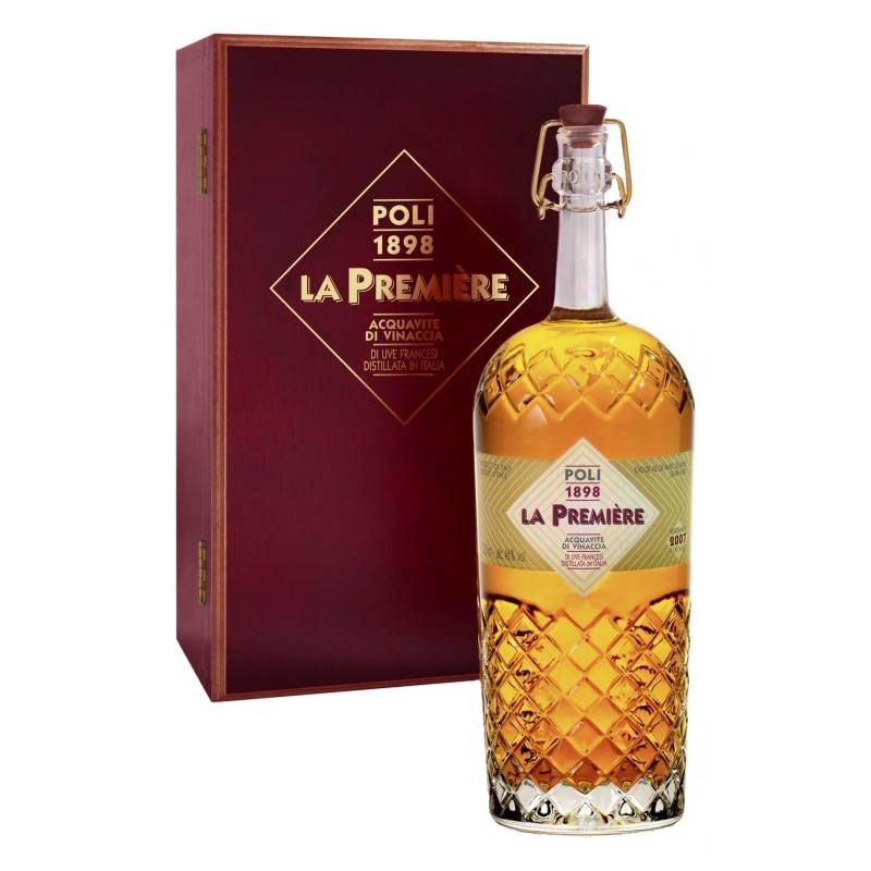 Grappa La Premiere di Poli cl 70 in cassa legno ottenuta dalla distillazione di vinacce francesi petit verdot del più rinomato Chateau Premier Grand Cru di Pauillac (Medoc) e da vinacce italiane aroma maestoso ed avvolgente