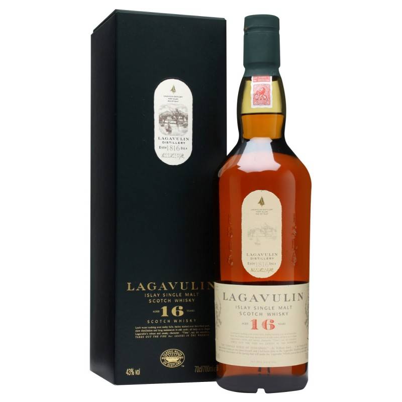 Whisky Lagavulin 16 anni cl 70 sentori marcati di torba fumo e frutta gusto dolce maltato e torbato con finale persistente