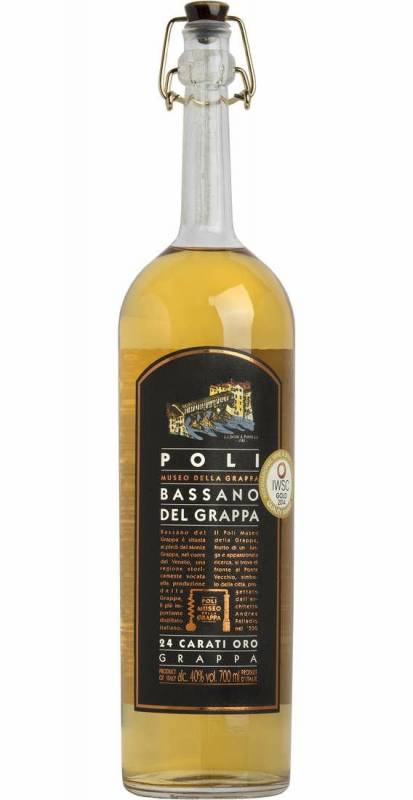 Grappa Bassano 24 Carati Oro Poli cl 70 da cuvée di vinacce di vitigni tipici della zona invecchiati in piccole botti di rovere francese aroma di legno tostato liquirizia e caffè gusto ben strutturato retrogusto di vaniglia e cacao
