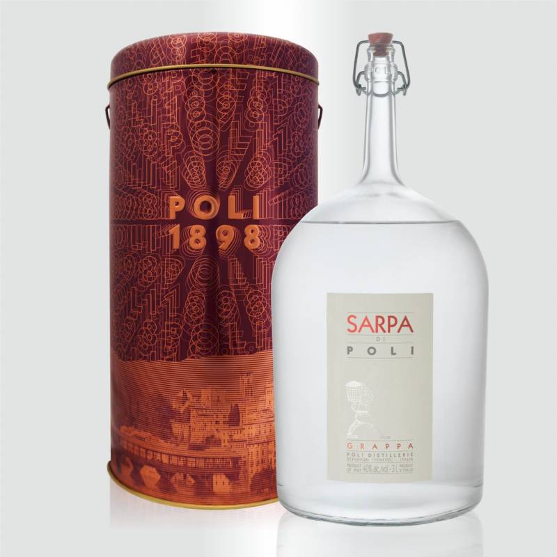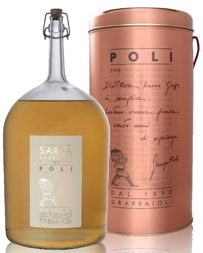 Grappa Sarpa Barrique Poli 3 litri in astuccio latta da vinacce di uve Merlot e Cabernet elevata in barrique di rovere francese aroma di frutta esotica e vaniglia gusto complesso ed avvolgente