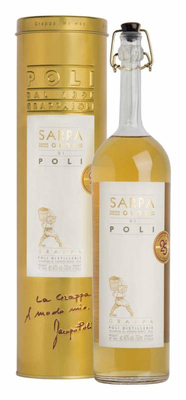 Grappa Sarpa Oro Poli cl 70 da vinacce di uve Merlot e Cabernet elevata in barrique di rovere francese aroma di frutta esotica e vaniglia gusto complesso ed avvolgente