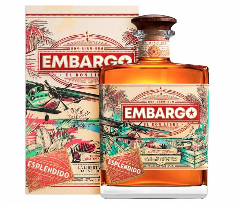 Rum Embargo Esplendido Anejo cl 70 l'unico rum composto da un blend di tre rum provenienti da Trinidad e Tobago, Martinica e Guatemala al palato le note di canna da zucchero si mescolano con il limone candito e la frutta tropicale