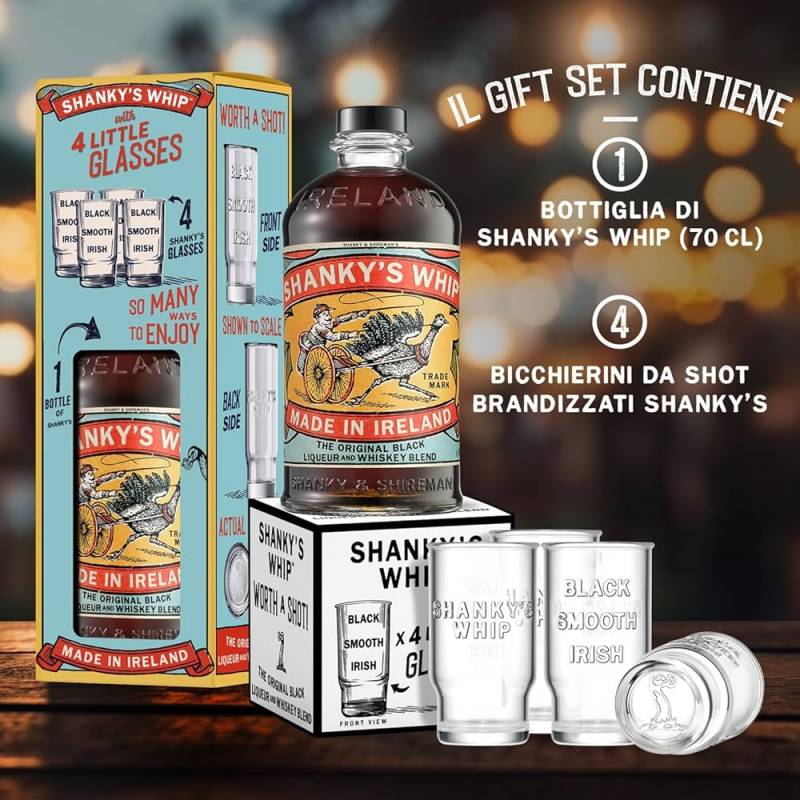 Shankys Whip Black + bicchieri shot personalizzati nato dall'incontro tra whisky irlandese e aromi di crema alla vaniglia e caramello gusto morbido e raffinato ottimo gustato nei bicchieri personalizzati
