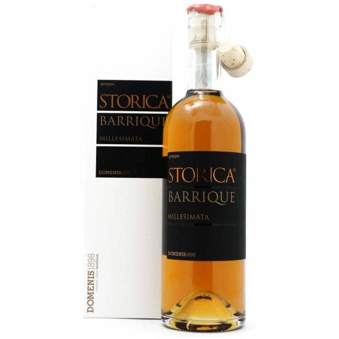 Grappa Domenis Storica Barrique cl 50 un paziente invecchiamento in selezionate barrique francesi per oltre 18 mesi colore dalle sfumature ambrate e ramate al palato morbida con lunga persistenza