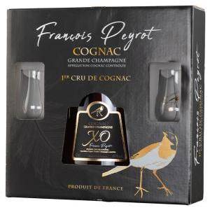 Cognac Peyrot XO e 2 bicchieri Grande Fine de Champagne elegante, pieno e complesso maturato per almeno 6 anni in botti di rovere ha un bouquet articolato e vario di frutta secca miele e legni nobili setoso alla bevuta