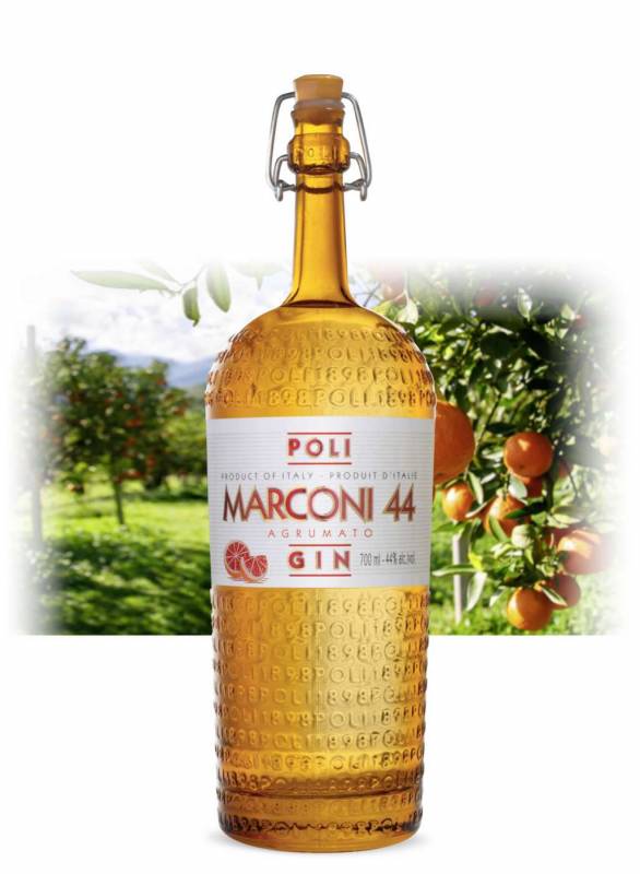 Gin Marconi 44 Poli cl 70 ottenuto da un'infusione che ricorda la solarità di un aranceto è composto da bacche di ginepro scorze di Pompelmo Rosa Limone Arancia amara e Arancia dolce semi di Cardamomo e Coriandolo