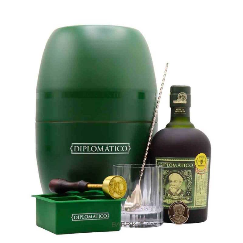 Rum Diplomatico Reserva Exclusiva cl 70 pack Old Fashioned una bottiglia di Reserva Exclusiva in contenitore di metallo un barspoon per la miscelazione un timbro ice cube e un thumbler basso targato Diplomático
