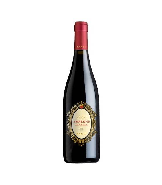 Amarone del Valpolicella Santico Santi cl 75 matura per 30 mesi in botti di rovere francese e 6 mesi in bottiglia, profumo ricco e fragrante gusto rotondo dai tannini vellutati ottimo con piatti saporiti, cacciagione e carni rosse