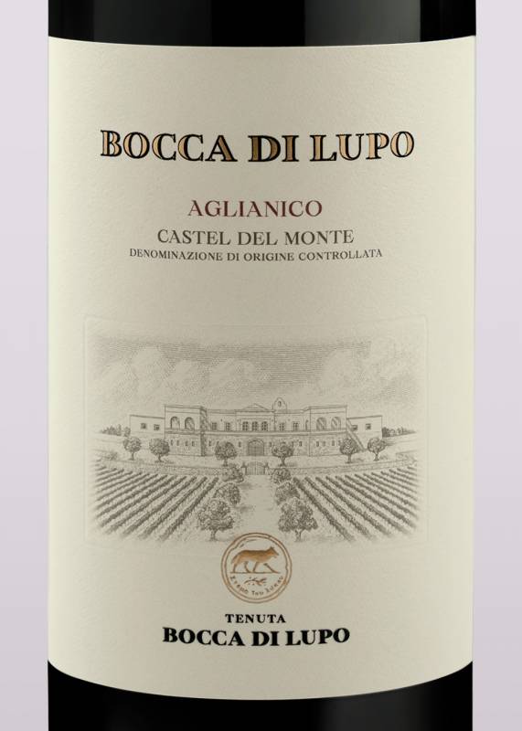 Vino Bocca di Lupo Doc Aglianico cl 75 fermentazione malolattica di 15 mesi in barrique di rovere poi affinamento in bottiglia per 24 mesi grande struttura equilibrio e morbidezza