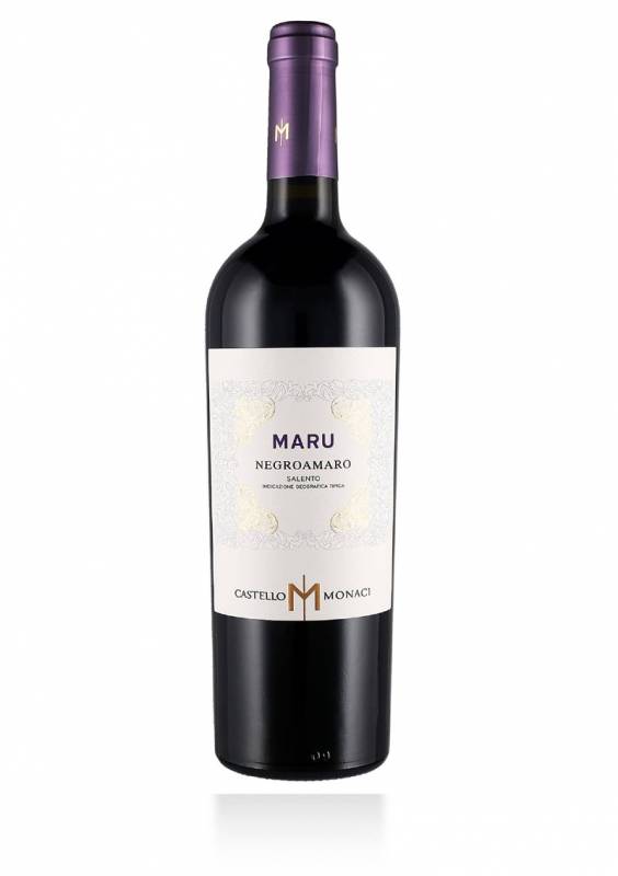 Vino Negroamaro Maru Castello Monaci cl 75 in parte affinato in barrique francesi sapore pieno rotondo morbido si presta ad un buon invecchiamento ottimo con carni in genere stracotti selvaggina e polpette al sugo