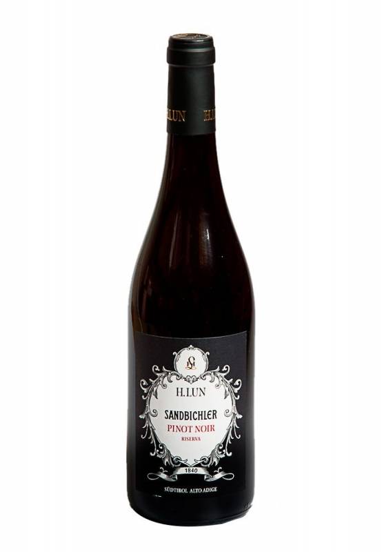 Vino Pinot Nero Riserva Sandbichler H. Lun cl 75 passato in barrique nelle botti grandi di legno bouquet con sentore di bacche rosse gusto pieno vellutato da gustare nelle occasioni conviviali