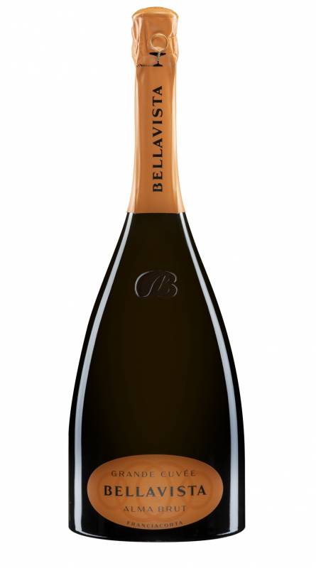 Bellavista Alma Cuvée brut cl 75 in astuccio dal perlage fine e fitto al naso profumi di fiori bianchi, note di erbe aromatiche, tocchi agrumati e di lievito, accenni di vaniglia; al palato è fresco, con una nota sapida nel persistente finale